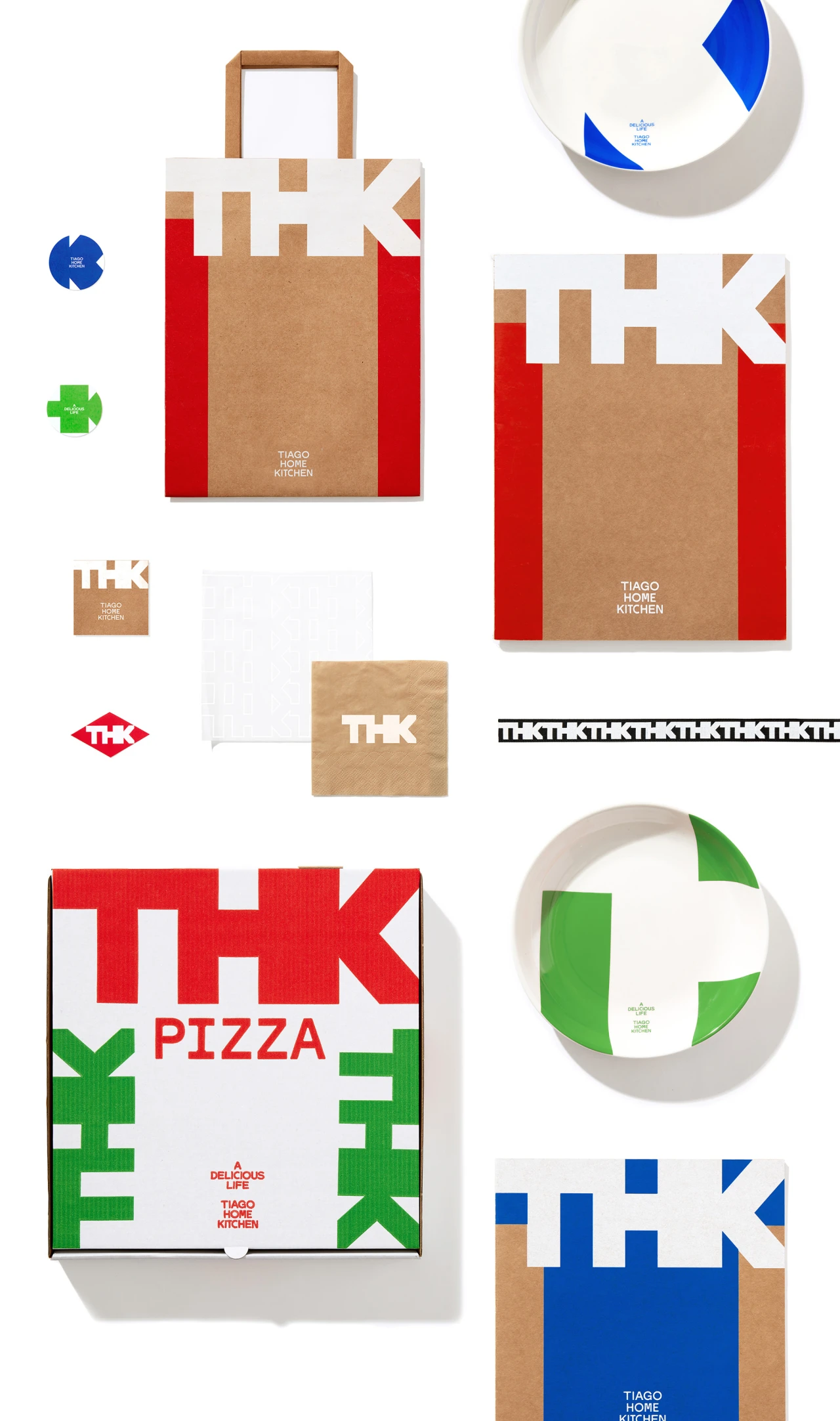 THK wanted to draw inspiration and pay homage to other aspects of Italian culture. The Visual identity inspired by Italin mid-century modern contours and forms. We wanted the THK lettering to exist almost as an object itself, a sculpture or an art piece. We wanted to give a nod to the robust boldness and warm tactility of mid-century modern furniture and designer goods. The word mark was thus as much about finding a form that reads both as a whole and as three letters.The mix of red, blue and green is primary, raw and humane. They have a sense of purity that is naive and approachable. They speak to THK dedication to delivering classic cuisine that is all about the taste of ingredients and tradition. Nothing fancy, fusion, or elevated, just good old pasta and pizza dishes, that are made of humble ingredients. We wanted our colors to reflect the love of food that is basic but just satisfying, understated but powerful at the same time.